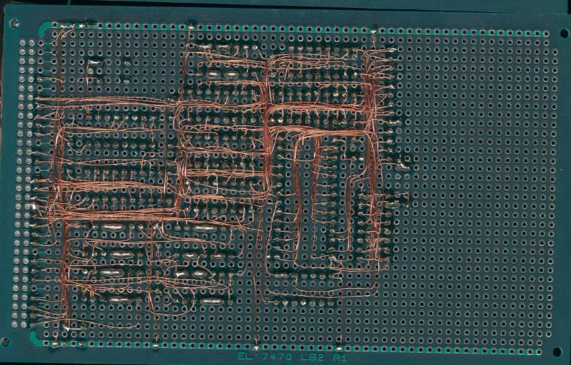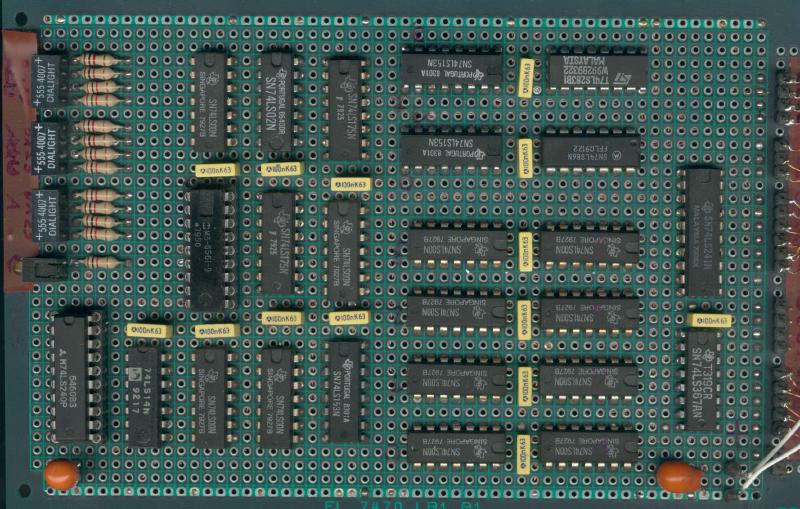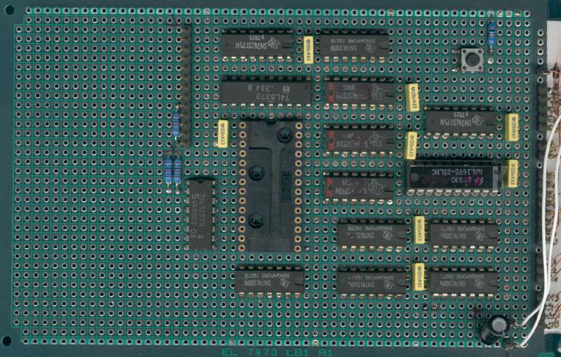 The CPU circuit was designed on paper and built on three veroboards. It is difficult to believe, but the circuit worked on the first power up. A few photos of this mess are displayed at the bottom of this page.