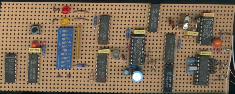 PLL board, component side. This board generates the required two phase clock signal. In addition it allows single step clocking for debug purposes. The clock frequency can be adjusted between fractions and multiples of a MHz, using the DIP switches and the jumpers. The two phase clock and lots of extra trouble could probably have been avoided by spending additional thought on the design.
