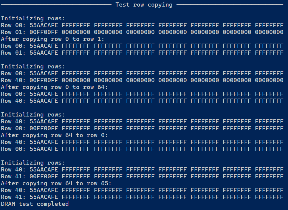 Now that we can set/erase entire rows, lets move on to another exploit: Copying rows. This approach has been outlined in RowClone: Fast and Energy-Efficient In-DRAM Bulk Data Copy and Initialization in 2013.