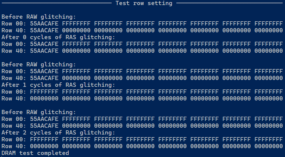 The log above shows the results of applying different numbers of RAS low glitches. First we write a dummy pattern into row 0 (noninverting) and row 0x40 (inverting). Then the glitch is applied 0,1,2 times.