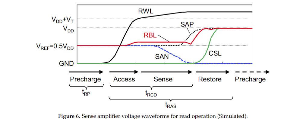 Image from M. Hwang et al. https://doi.org/10.3390/electronics8080865 CC BY I used a transimpedance amplifier to measure the current consumption of a DRAM during the row access, as shown below. We can see a spike associated with the row activation, which likely stems from charging the wordline, which is connected to the gates of all transistors of the row we want to access. While RAS is low, we can see an increase current consumption from the read amplifiers. Once the row is deactivated, we can see another current spike that is associated with pulling low the word line and precharging the bit lines.
