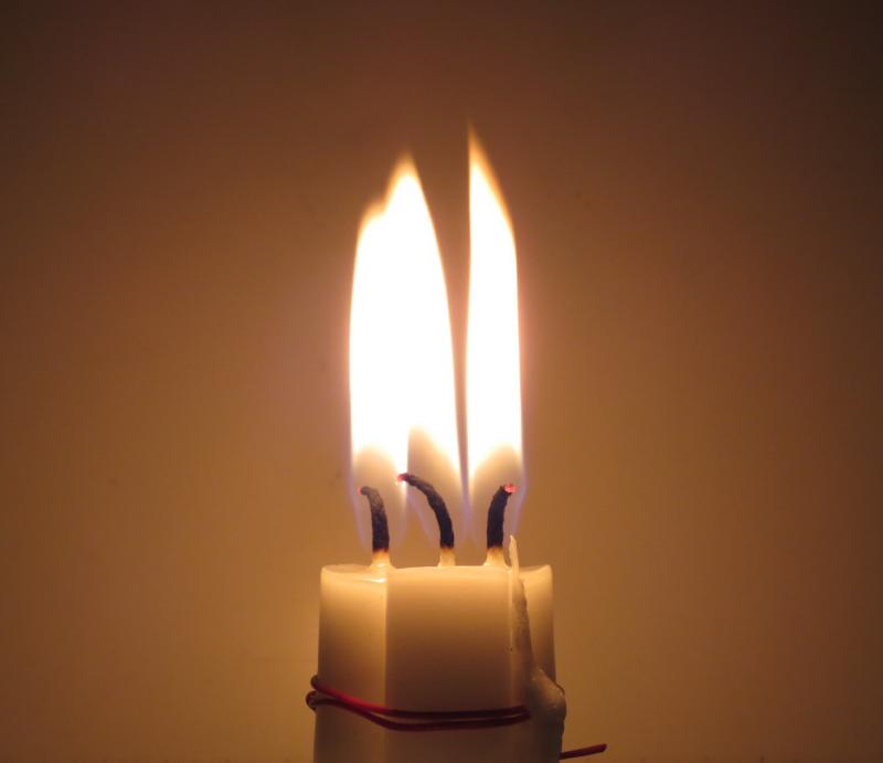Todays candles have been optimized not to flicker. But it turns out when we bundle three of them together, we can undo all of these optimizations and the resulting triplet will start to naturally oscillate. A fascinating fact is that the oscillation frequency is rather stable at ~9.9Hz as it depends mainly on gravity and diameter of the flame.