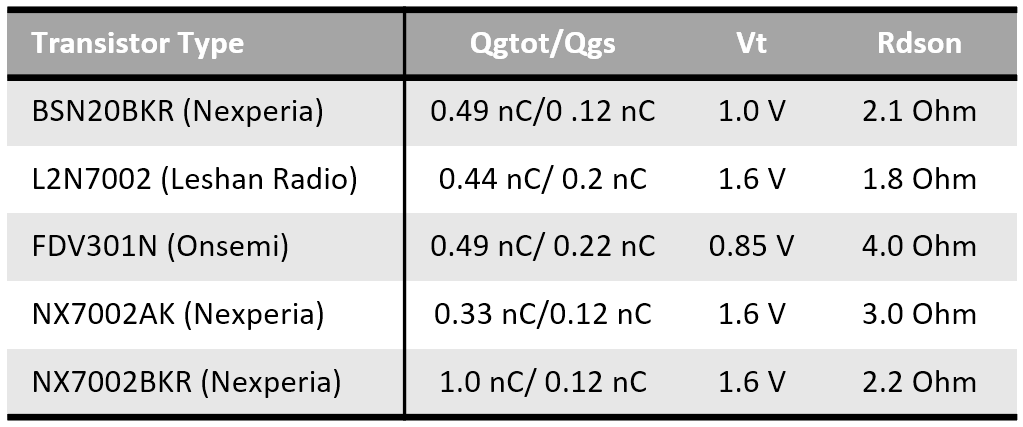 A list of candidate devices is shown below. Most of these are variants of the ancient 2N7002. The FDV301N is a device targeted at replacing digital bipolar transistors and therefore appears to be especially suitable.