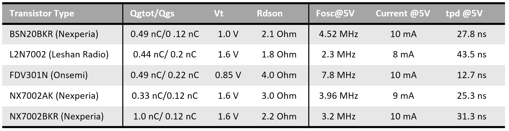 As was already clear from the difficulty of identifying suitable N-MOSFETS for building discrete NMOS-Logic, there is no perfect transistor available. The performance of the NMOS ring-oscillators does not really compare to the performance achievable with suitable bipolar switching transistors.