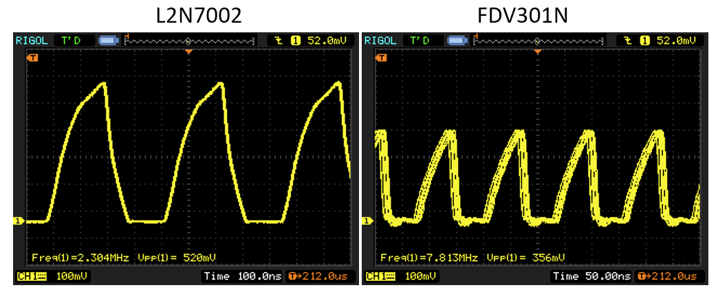 The FDV301N is by far the fastest transistor, there is no other contender. The off-brand L2N7002 is the slowest device at quite some margin.