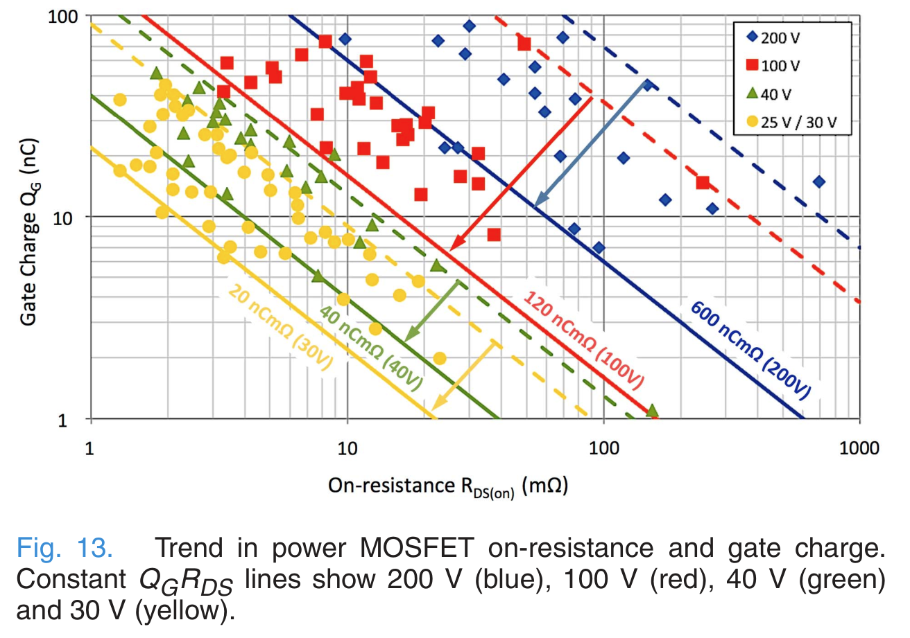 There is a catch again, as gate charge and RDSon are not independent, as shown in the figure above (taken from the execellent review here). Most power MOSFETS are optimized for low RDSon. As a consequence the Gate charge is increased. Since we only need an RDSon of a few tens of ohms, it would in principle be possible to reduce gate charge significantly by accepting a much higher RDSon. But alas, such a device does not exist on the market.