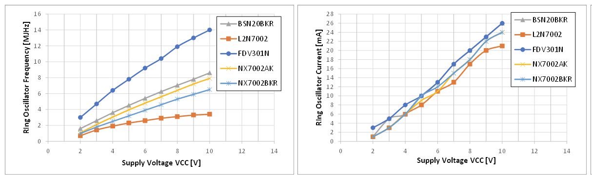 The images below show the ring oscillator frequency and current in dependence of supply voltage. We can see that there is quite some spread in frequency between candidate transistors. The spread in supply current is comparatively lower, since the current consumption is rather defined by the load resists..