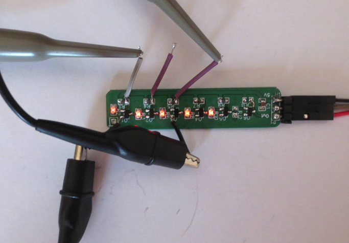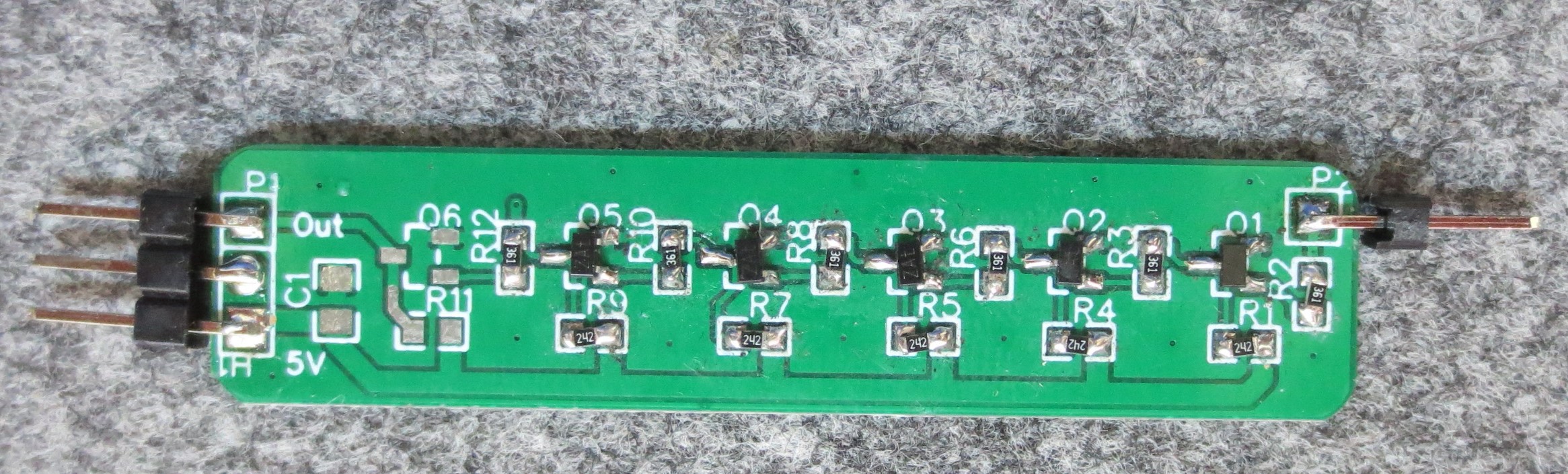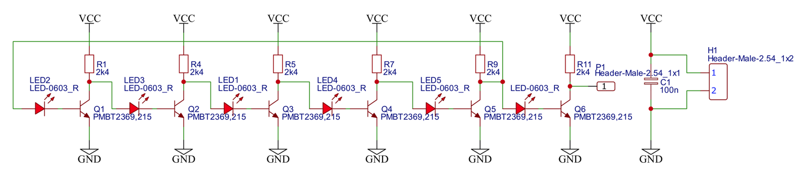The schematics are shown above. Please ignore the resistor values, I used 470 Ohm collector resistors in all cases. I built two versions: One with PMBT2369 and one with PMBT3904.