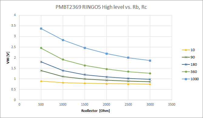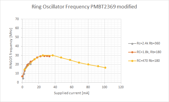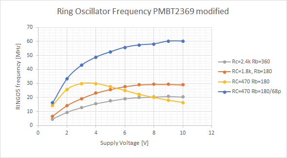 The figure above shows the relationship between supply voltage and oscillator frequency. Reduction of both base and collector resistor increases speed at the same voltage. It is somewhat obvious since availability of more current will allows faster switching up to the point when the saturation charge storage limits the turn-off time. Since the PMBT2369 is engineered to reduce charge storage time, it increases switching speed up to a fairly high current. However at some point this is not sufficient anymore and the speed begins to reduce again. This is visible for Sample 3 (Rc=470, Rb=180), which has a maximum at around 3V. Also sample 2 starts to get slightly slower beyond 8V.