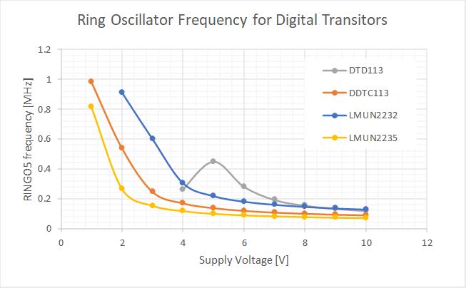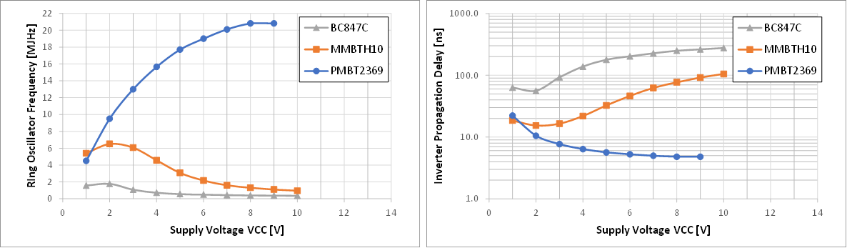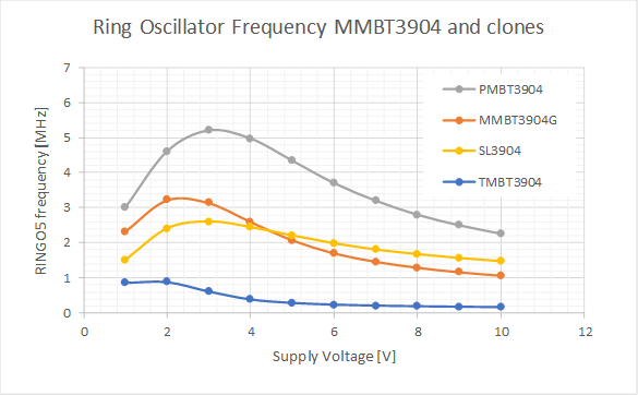 Ring oscillator results are shown above. Basically all devices enter an operational range where they are limited by saturation charge already at very low voltage. Practical gate propagation delays are in the 500-1500 ns range, a hundred times slower than the PMBT2369! There is a very small voltage range where the saturation charge does not dominate and the devices are slightly faster, but it seem impractical to bias devices into that regime.