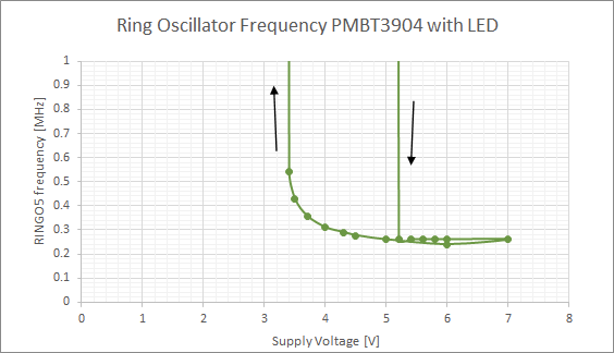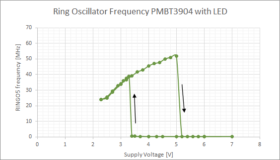 The plot above shows the ring oscillator frequency when sweeping the voltage up to 7V and then down again. There were quite a few surprises. First, the maximum frequency is above 50MHz, far above anything I had measured with the PMBT3904 before. Then, and this is even more suprising, above 5 V the frequency suddely drops to a very low value below 0.5 MHz - 100 times lower. When the voltage is lowered to below ~3.5 V, the frequency increases again.