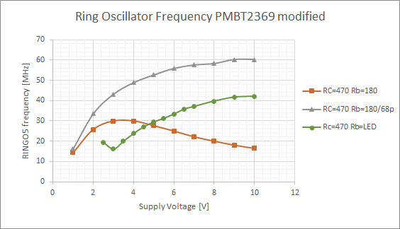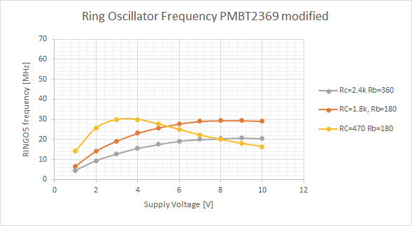 Results for a voltage sweep of the PMBT2369 based ring-oscillator are shown above in green, in comparison with previous results. Two things are apparent: