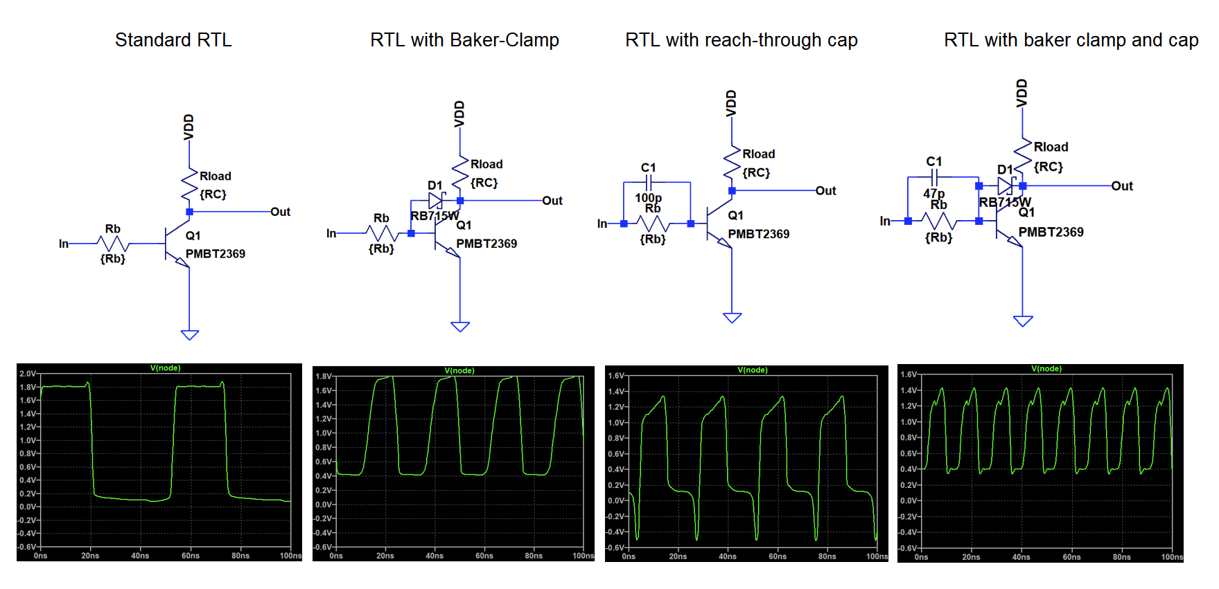 The baker clamp prevents saturation of the transistor by shorting the base with the collector if the base potential is too high. The choice of the diode is quite critical here: A schottky diode is needed to minimize forward voltage and the capacitance needs to be lower than CBC of the transistor to avoid excessive miller capacitance that could limit the turn-on time. Since the baker clamp shorts the base to the collector, also the low voltage level is increased to about 0.4V. Therefore, noise margin is drastically reduced for this solution, something that is not preferrable considering the already low noise margin of RTL.