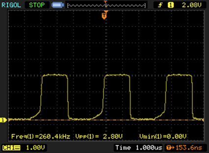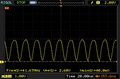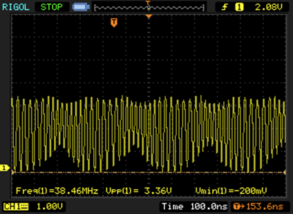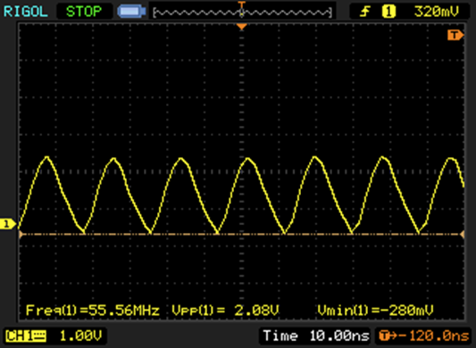 A scope trace shows that, despite the high frequency, there is still fully saturated switching. The signals looks a bit smoothed, which may be caused by bandwidth limitations of my probe and the scope (100 MHz):