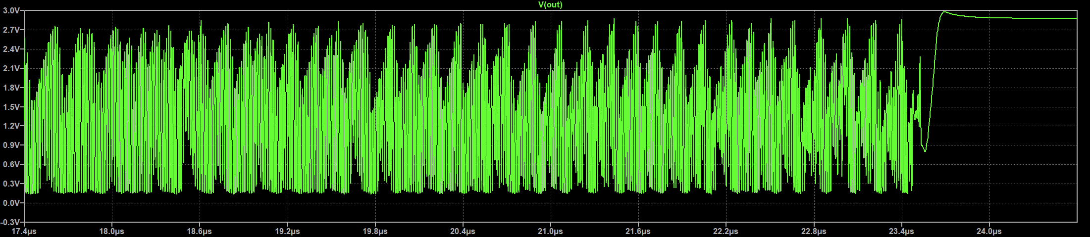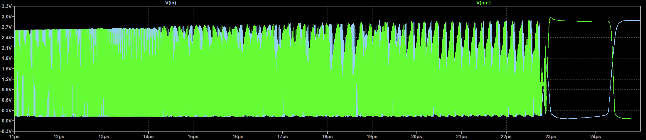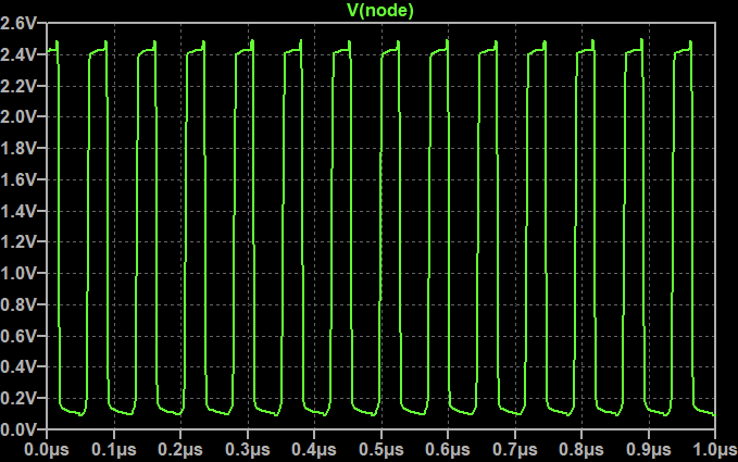The behavior is quite different in the high frequency branch. We can see a more symmetric waveform and the voltage newer reaches zero, indicating that the transistor is not fully saturation. Indeed it is more acting as a linear amplifier in this mode and this explains the much higher frequency. Increasing the length of the ring oscillator to e.g. 9 stages would most likely eliminate this behavior as there would be enough time to transition to saturation.