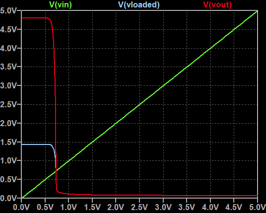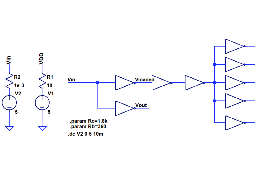 To test the transfer function, I used the DC sweep function in the circuit below. Since the loading of the output has a significant influence on the output voltages of an RTL gate I looked at both loaded and unloaded output.