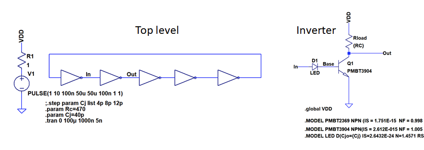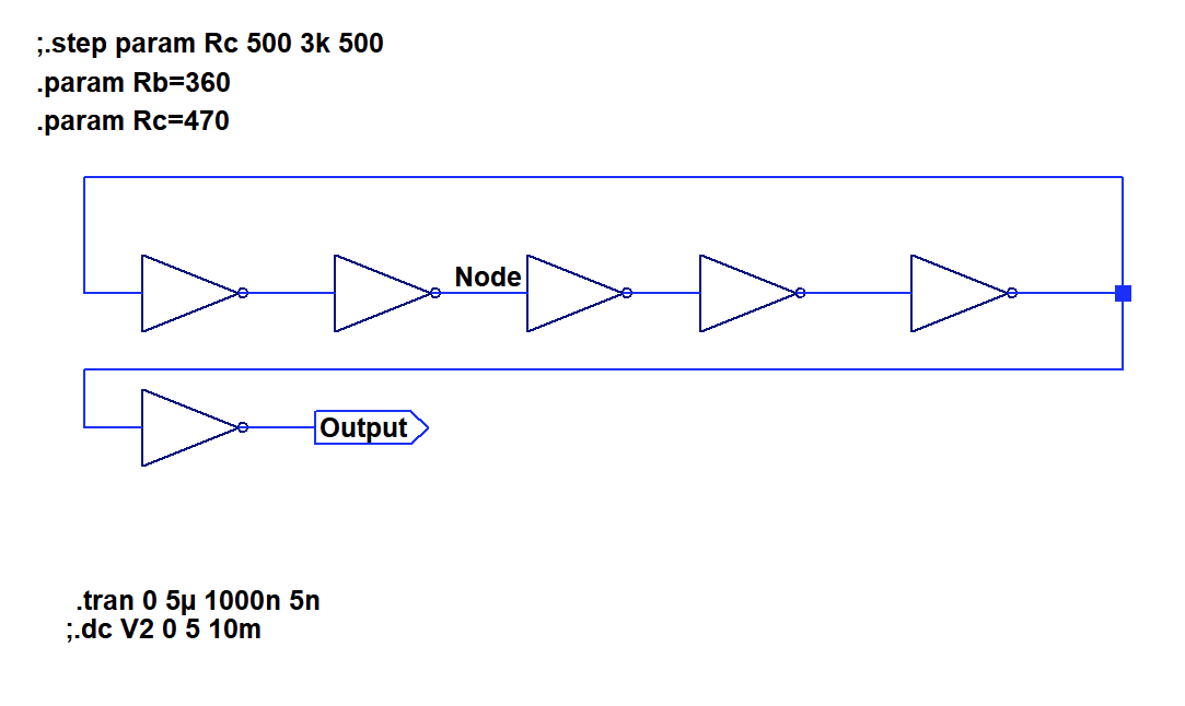 The images above shows a single RTL inverter including design settings. I used a 2.4 kOhm collector resistor and 360 Ohm base resistor for all investigations. To form an oscillator, an odd number of inverters have to be connected in a circular fasion.