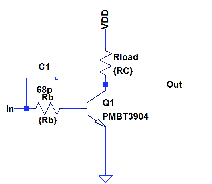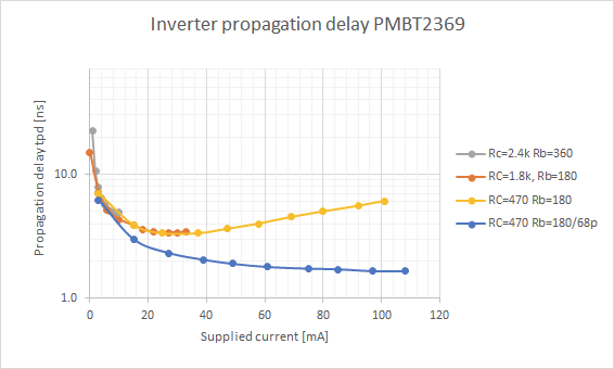 So, we established that the PMBT2369 is the fastest saturation-switching transistor available today and that it achieves a minimum propagation delay of 3.5 ns at a bias current level of 10 mA. How can we go further from there? Obviously, more brute forcing by changing resistor values and increasing currents is not the way to go. Alternatively we can add components to the basic RTL gate.