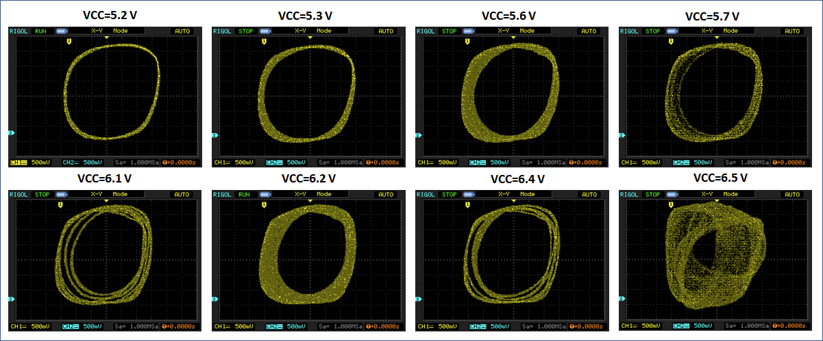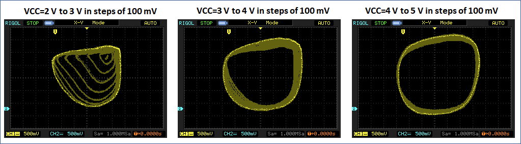 The plot above shows trajectories from 2 V to 5 V supply voltage in steps of 100 mV overlaid. In this range, the oscillator shows stable operation with limited noise. The shape of the trajectory changes due to a change in rise- and fall-times with voltage and due to smoothing caused by the limited bandwidth of the oscilloscope.