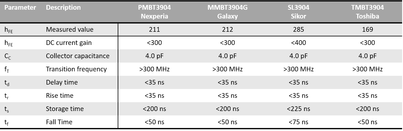 I compared On Semis and Nexperias flavors of the 2369. As you can see in the table above, their datasheet values are basically the same. I measured hfe and found the onsemi device to have slightly higher gain.