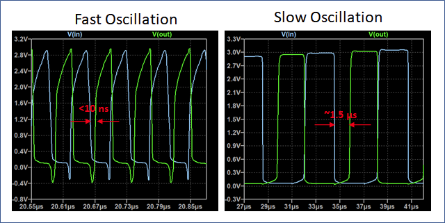Looking at the detailed input-output relationship of the inverter already shows some differences: When the input goes hi, the output is immediately pulled to low, both in fast and slow oscillation mode. Things are quite different for that falling edge of the input signal: In slow mode, that output rises with a delay of almost 1us, while it almost immediately risis in fast oscillation mode.