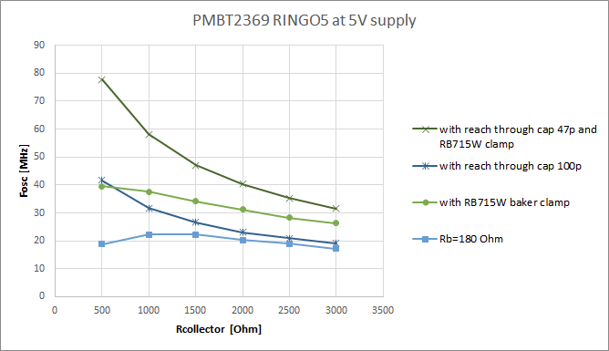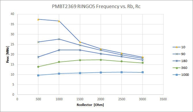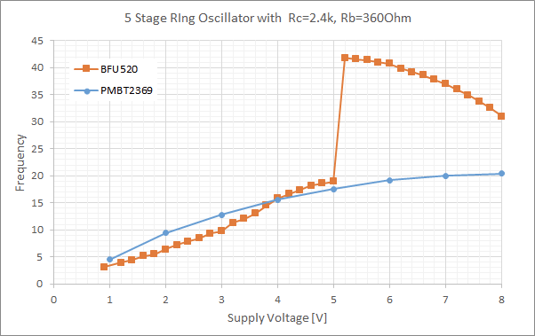 The behavior of the BFU520 ringoscillator is quite curious. At low voltages it shows performance that is comparable to that of the PMBT2369. At 5V there is a sudden shift to a different oscillation frequency twice as high. (I did not record results beyond 8V, but the frequency did monotonically decrease)