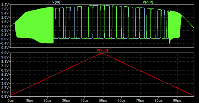 I set up the model as a transient simulation that sweeps VDD. You can see the result above. The upper pane shows the voltage at the input and output of one of the inverters withing the ring oscaillator. The lower panel shows the supply voltage over time.