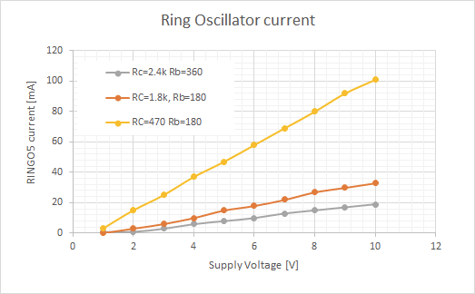 Calculating the propagation delay from the ring oscillator frequency shows that a minimum tpd of around 3.5 ns is achived at around 30 mA of supply. Since RTL gates only draw current when their input is “high”, only half of the six gates (5 ringo + 1 buffer) are active at any time. This means that the bias current per gate is approximately 30mA/(6/2) = ~ 10mA.