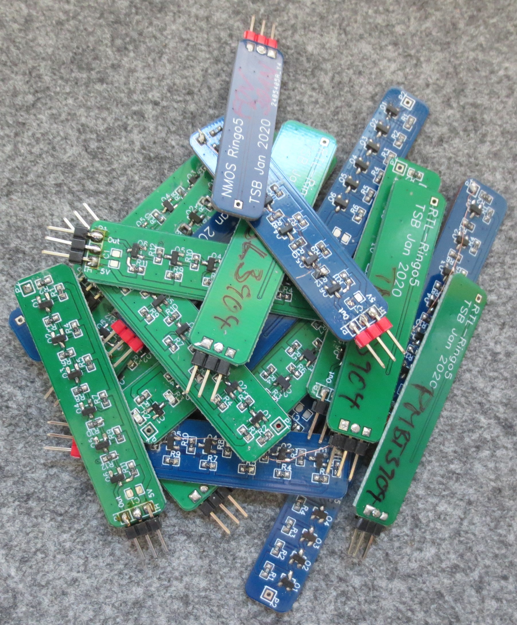 To speed up the propagation time of the inverters in the ring-oscillator further, I built up samples with smaller base and collector resistors.