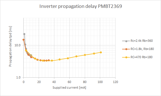 Finally, looking at the bias current / tpd trade off, we can see that the seemingly unsurmountable trend of pure RTL has truely been beaten and less than 2 ns tpd is achieved at higher current. Quite an astonishing result for discrete saturation logic!