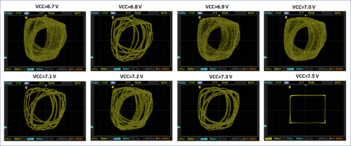 Again, clear limit cycles at 6.8 V, 7.1 V and 7.3 V. At 7.5 V the oscillator finally switches to the low frequency mode.
