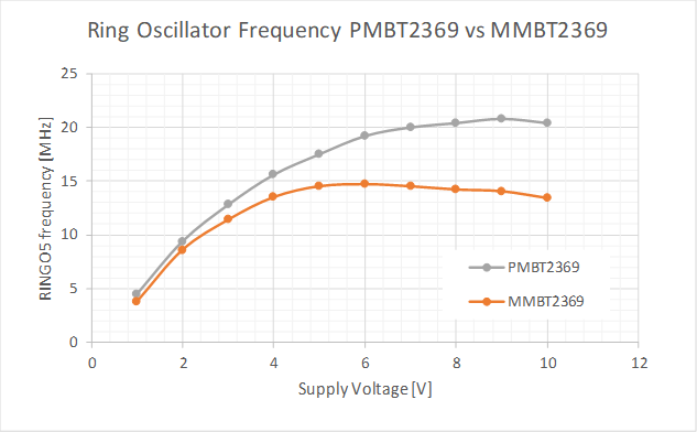 The plot above shows a comparison of both devices. It appears that the PMBT2369 is quite a bit faster. The MMBT2369 shows a maximum at around 5V supply. At higher voltage (current), the saturation charge seems to dominate switching behavior. This trend can only be seen at >8V for the PMBT2369.