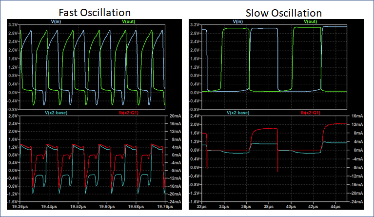 This suggest that the slow oscillation mode is dominated by base saturation charge storage time, while this is somehow eliminated for the fast mode. Please note that also in the fast mode, there is full saturation switching going in, the transistor is fully turned on and off as can be seeen from the voltage swing.