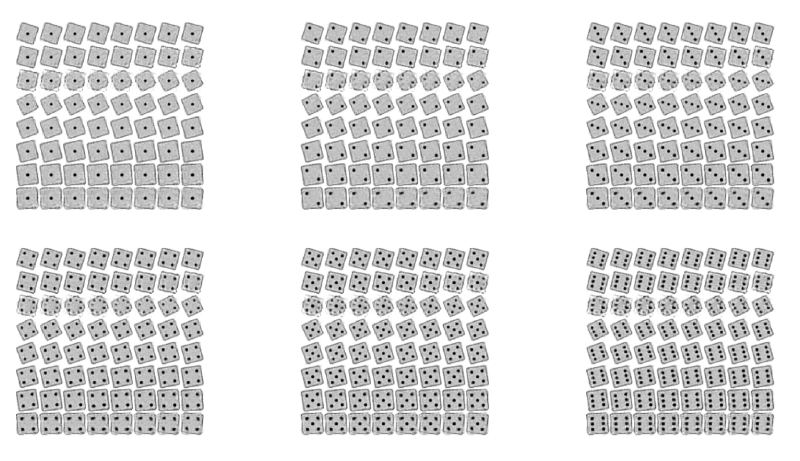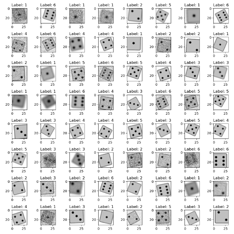 Images are created in 128x128 and then downscaled to 32x32 to introduce some antiailiasing. The die images are rotated by an arbitraty angle to introduce variation. It should be noted that rotation of the dies requires them to be scaled down, so they are not clipped. This will introduce also a variation in scaling to the dataset.