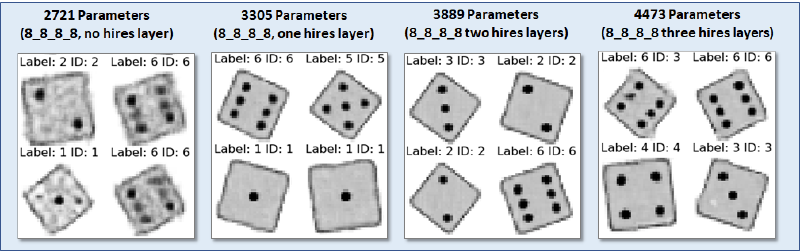The improvements are even more impressive when looking at the visual quality. The 8_8_8_8+two hires layers combination provides generated image very close to the original at less than 4000 weights. However, at these settings, 16kb of SRAM would be needed to store the temporary data of the hires layers during inference.