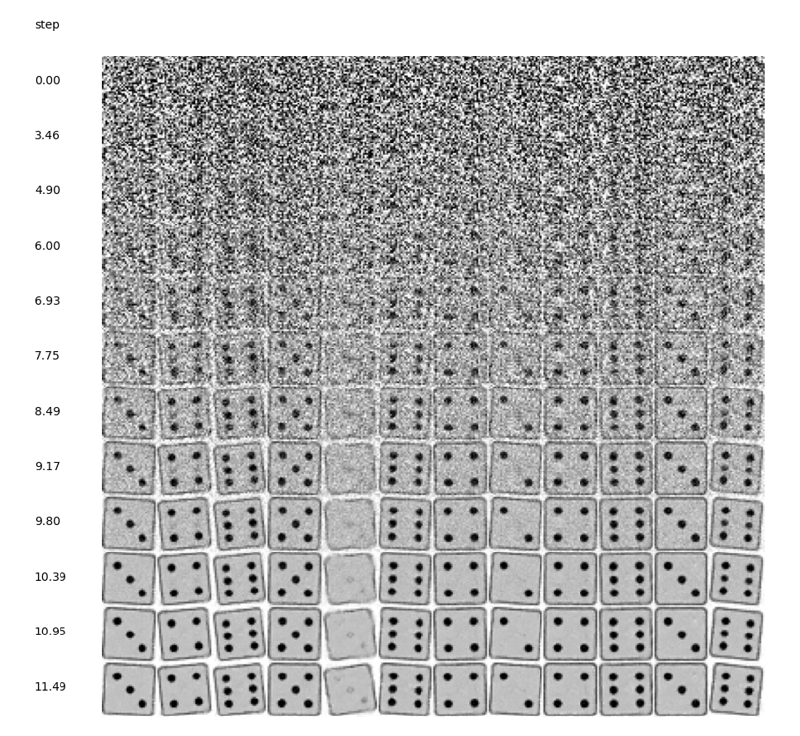 The plot above shows a scan through the entire latent variable from -1 to 1 (TL to BR) for 3 pips. We can see that the ordering is not strictly following the angle, but some other criteria. Due to this, there are a few transitional regions, where ghost images are created that look like a superposition of multiple angles instead of a smooth transition.