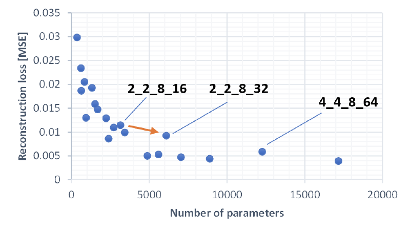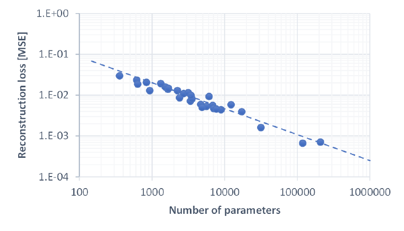 The figure above shows a log-log plot of number of parameters vs. reconstruction loss for all test runs. We can see that they roughly follow a line with a slope of -2/3, regardless of chosen network structure. This is quite fascinating and basically indicates that any added parameter improves the image quality and the image quality is inversely proportional to the number of parameters. There are diminishing returns, of course.