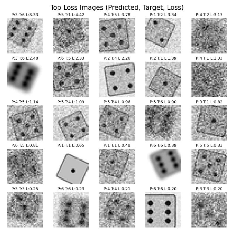 The accuracy on the test dataset dropped to 98% now (984/1000). The 25 images with the highest loss are shown below. Obvsiously, adding a lot of noise and blur makes it difficult to detect the number of pips. But there are also some suprising outliers.