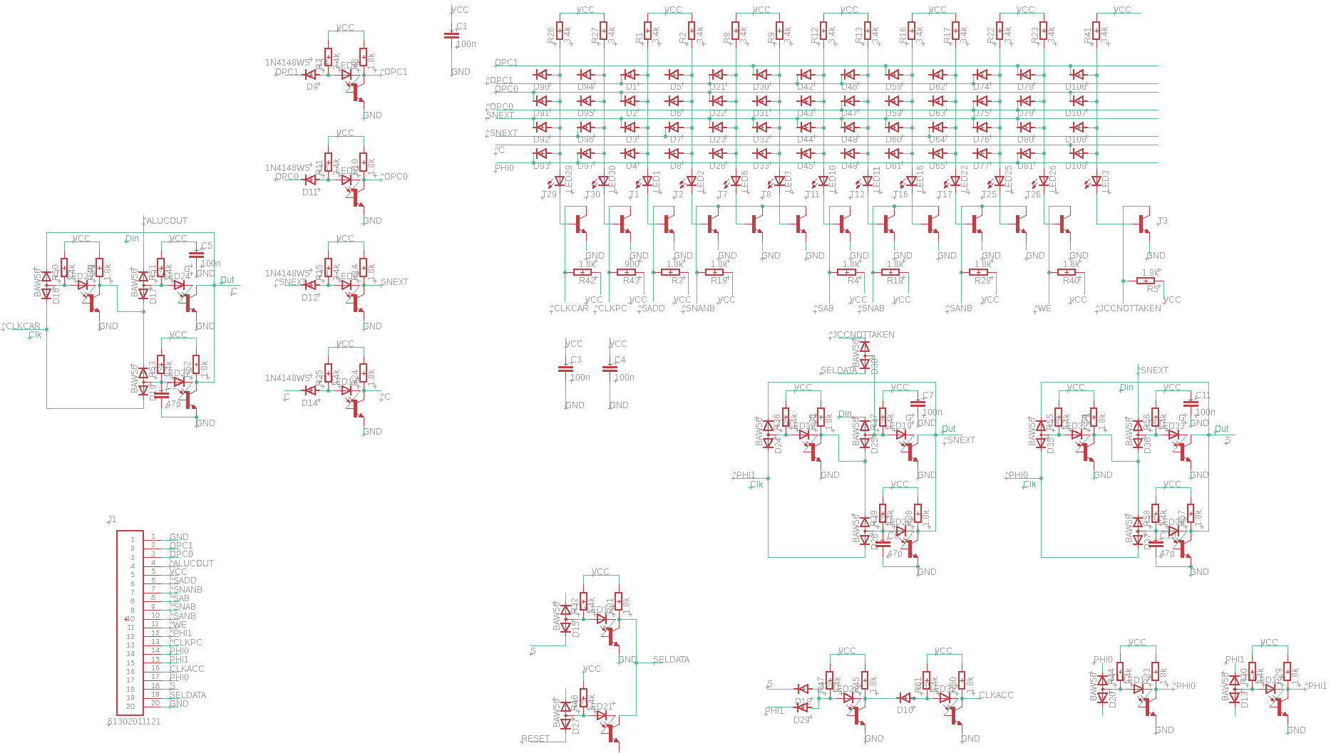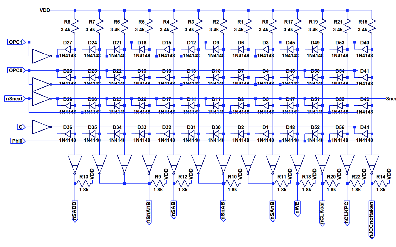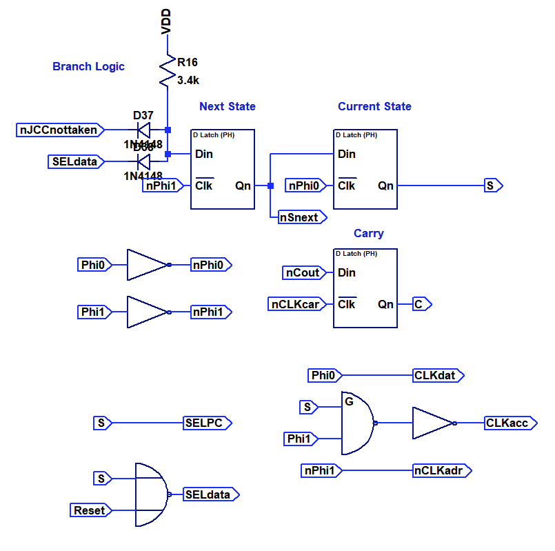 Many of the simpler control signal encodings could be directly mapped to single gates. In additional you can find three latches for Carry signal and state enconding here, in what could best be described as “sea of gates”. Very tedious to layout on the PCB, but straightforward in implementation by using the building blocks I designed earlier.