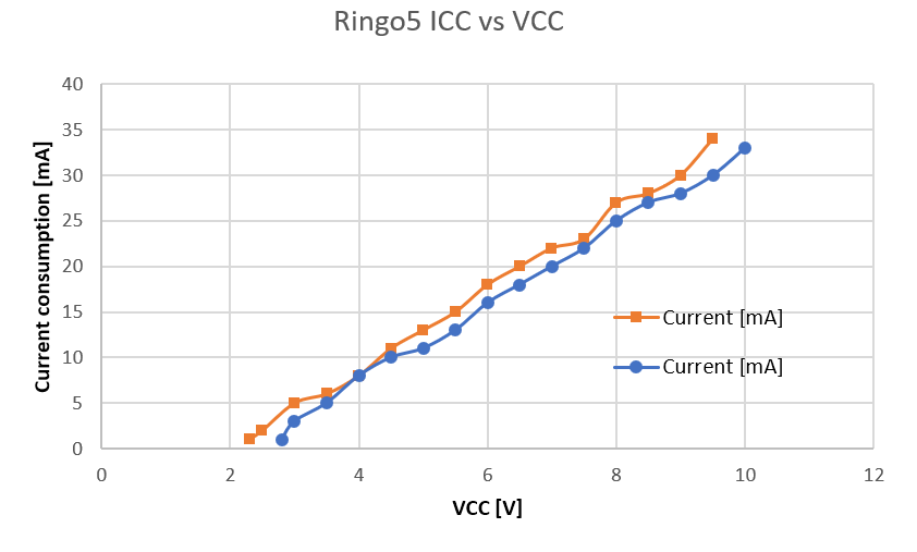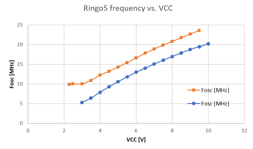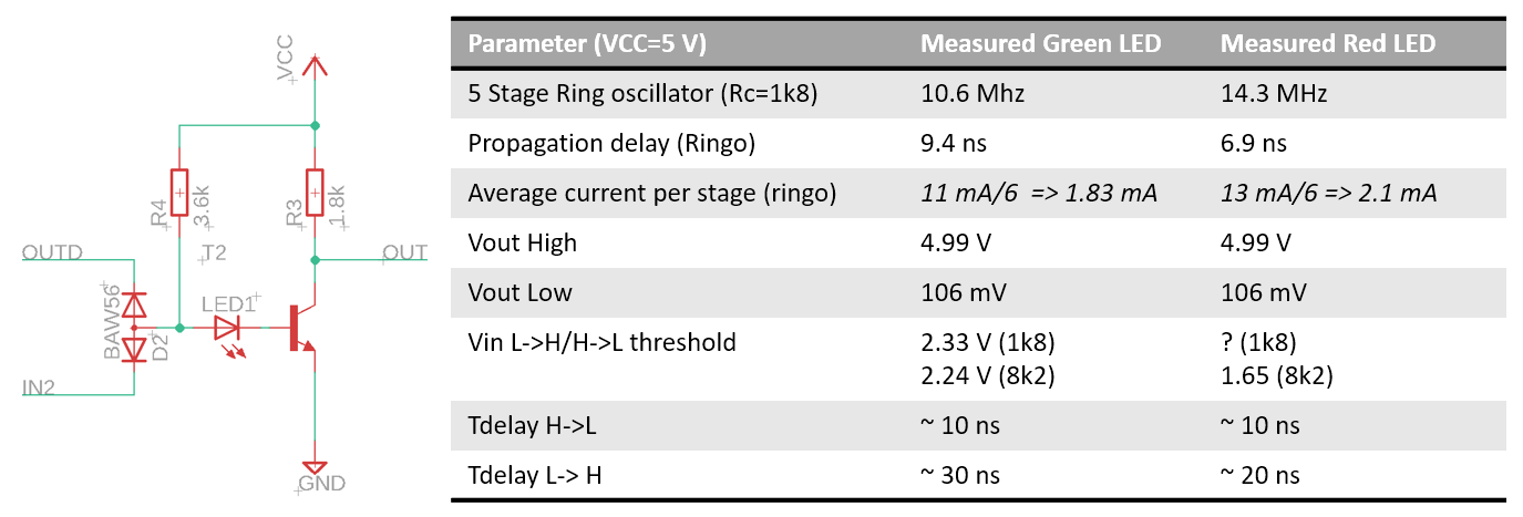 The diagram above shows measurements of ring oscillator frequencies versus supply voltages. The blue line corresponds to the inverter with green LED, the orange line to a red LED. There is a clear trend towards higher frequency for higher supply, which can be explained by the availability of more switching current. The red LED LTL gate has a lower threshold voltage and does therefore switch earlier and faster. Since this design is based on the PMBT2369 switching transistors, no dominant influence of base saturation is observered. LTL gates with normal small signal transistores should exhibit a speed-supply relationship similar to what I observed with RTL.
