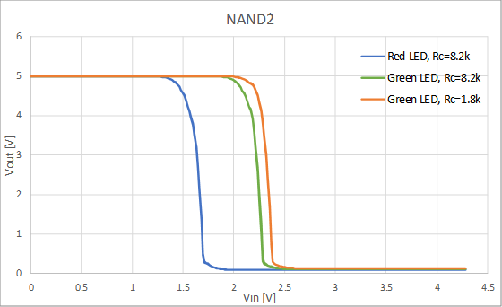 Transfer characteristics were measured by using the DAC and ADC of an ATtiny416. You can see that different LEDs can be used to adjust the threshold levels of the NAND2 gate. Red with a low forward voltage leads to a L->H threshold around 1.65 V while green as it 2.24/2.33V depending on collector resistor.