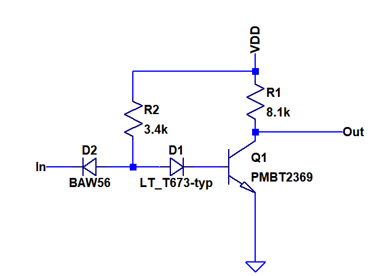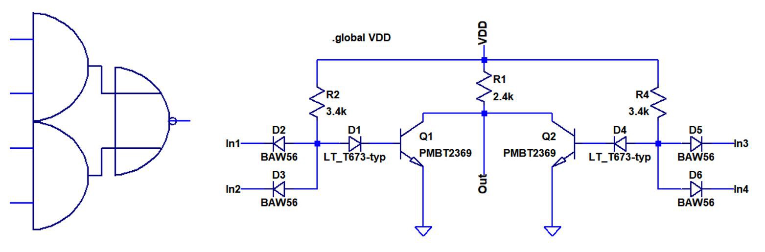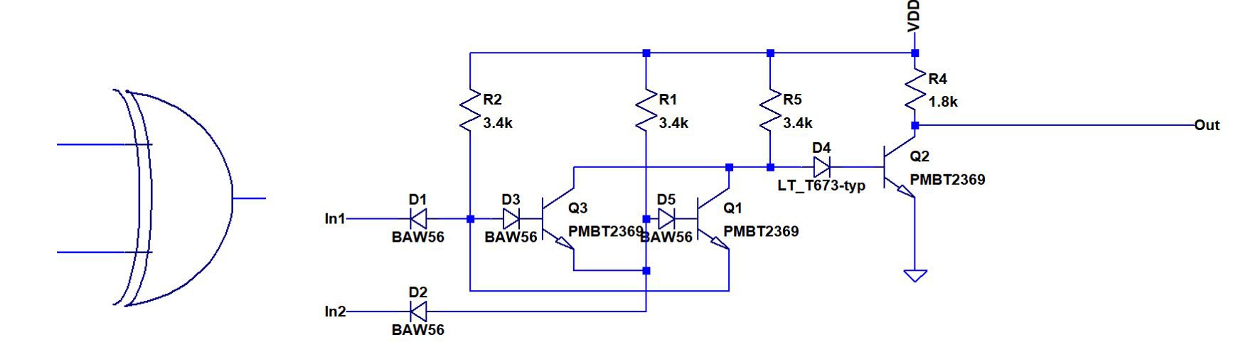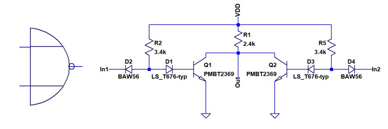 But what is the impact on the circuit behavior? Usually we would like to use fast switching diodes for any logic circuit. Switching diodes are optimized for low capacitance and low recovery time to be able to switch very fast between forward and reverse operation. Here I am using a BAW56 dual diode, which has a capacitance of 2pF and 6ns reverse recovery time, as the input diode. LEDs are not optimized for switching operation. They typically have a fairly high capacitance of around ~40pF and take long time to be switched off. Therefore, using an LED in place of D2, the input diode, would slow down the gate significantly.