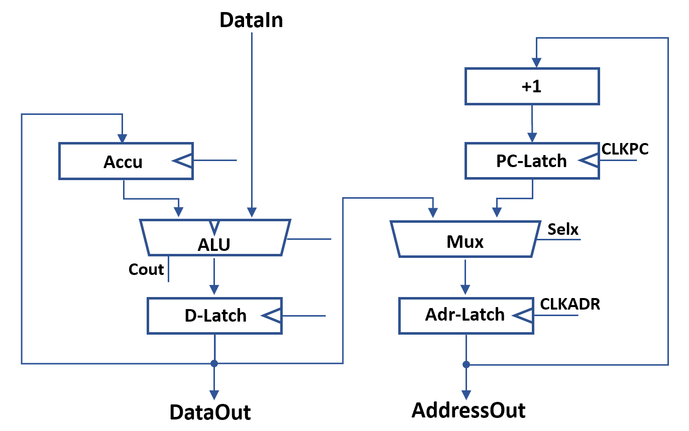 I lot of deliberation followed, also considering to merge accu+data latch into one edge triggered register as done in the original MCPU. The problem is, in that case an additional data input latch has to be added to the address-datapath. In the end it turned out to be more part-count efficient to stay with the latch based architecture.