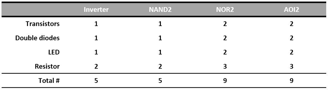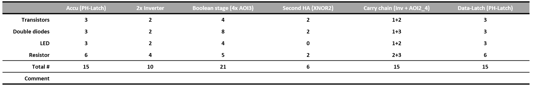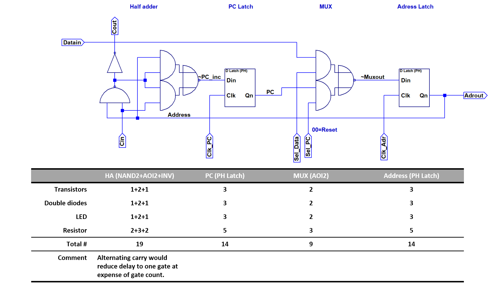 Finally, a list of part counts for each gate. Since my intention is to build a CPU with a minimal amount of discretes, it is important to keep track of this.