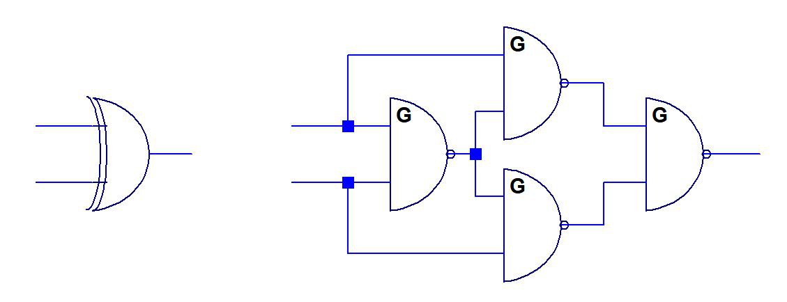 A straightforward approach is to build a XOR2 gate from 4 NAND gates. This is simple and robust, but results in a propagation delay of three NAND2 equivalent. Not perfect for fast circuits. Also, the component consumption is quite high.