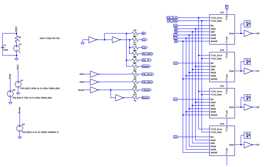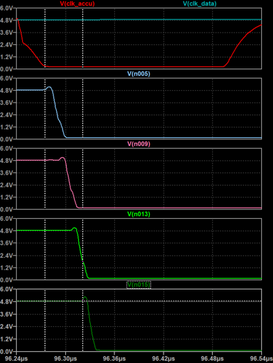 The image above shows carry propagation through all stages. The carry is low active. The carry propagation delay is approximately 11 ns per stage (45 ns total for 4 stages). Although this will propably increase in the real circuit due to more parasitics, it is a very reasonable result and suggests that an acceptably high clockspeed can be achieved even without resorting to a more elaborate carry chain architecture.