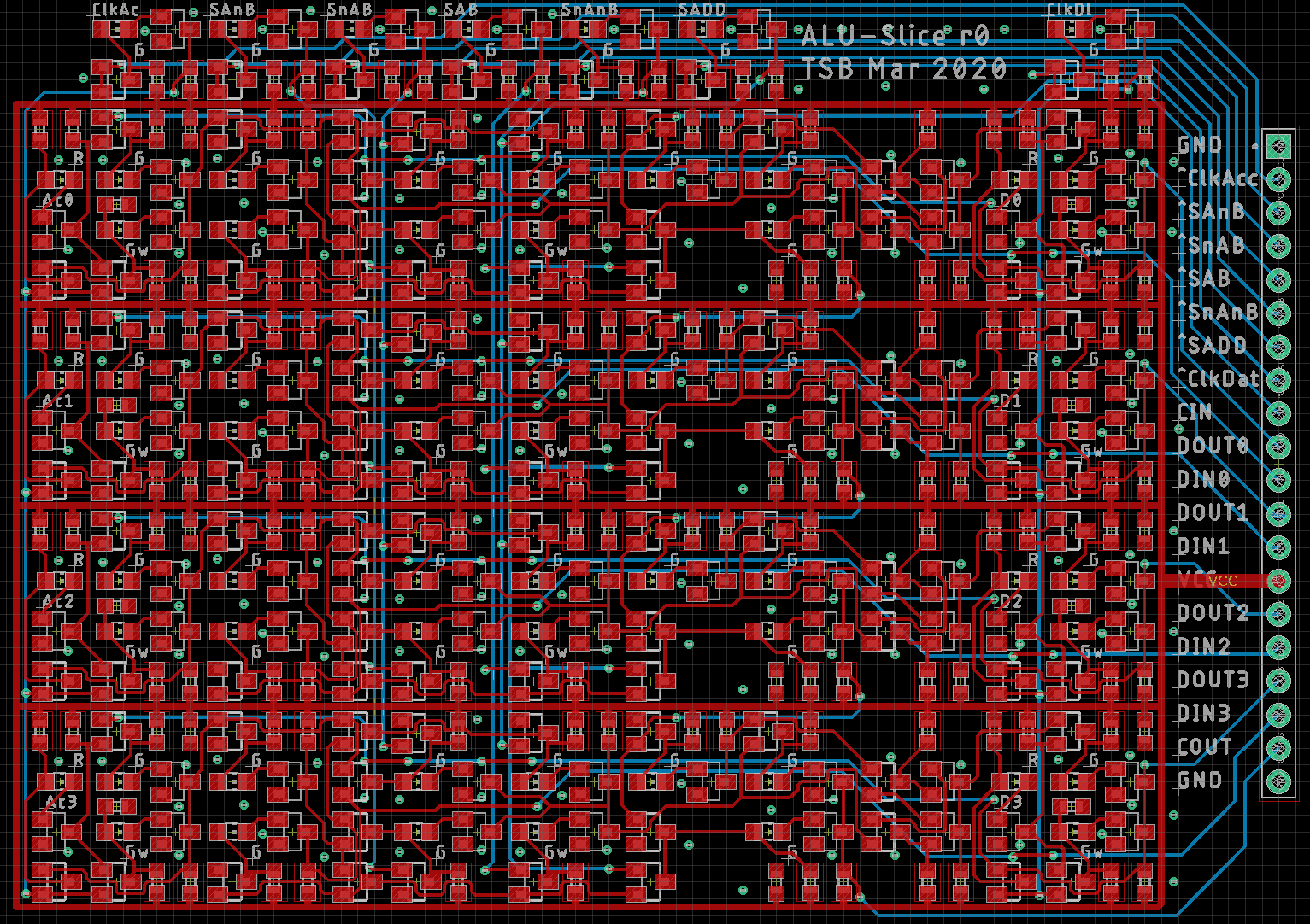 The full layout, excluding ground plane, is shown above. Again, it was possible to fit four bit-slices on one board. In contrast to the previous design, I decided to include buffers for the control signals, located at the top. The fan out of the clock signal on this board is 8 gates. Combining several boards requires a clock tree for proper drive-ability.