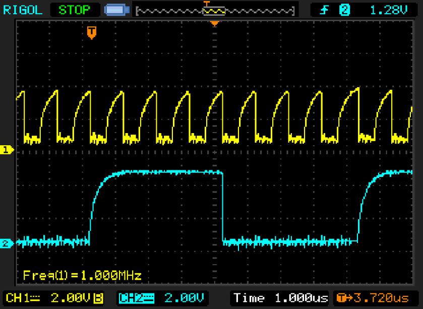 The scope screenshot shows the input (yellow) and output (turquoise) waveform of one inverter in the ring oscillator (green led). The falling edge is steep since it is actively pulled down by the transistor. The rising edge is, again, separated into two regions depending on wether only collector resistor or base and collector resistor are involved in pulling up the node.