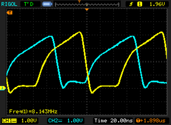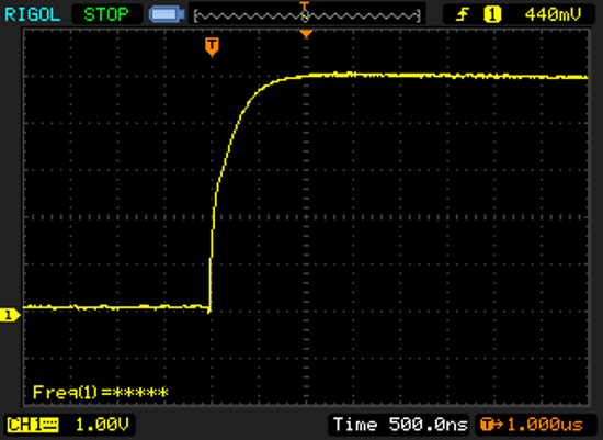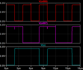 The behavior of the NAND2 gate with 1.8k collector resistor, as shown above, is more consistent and shows a fast rising edge up to Vhigh. I therefore decided to focus on using 1.8k as a collector resistor.