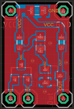 After characterizing a basic NAND2 gate, the next step is to measure the timing properties of the LTL gate. For this purpose I built a ring oscillator based on five gates. The PCB design is shown above. I added one additional inverter as an output buffer to avoid loading of the oscillator while measuring its frequency.
